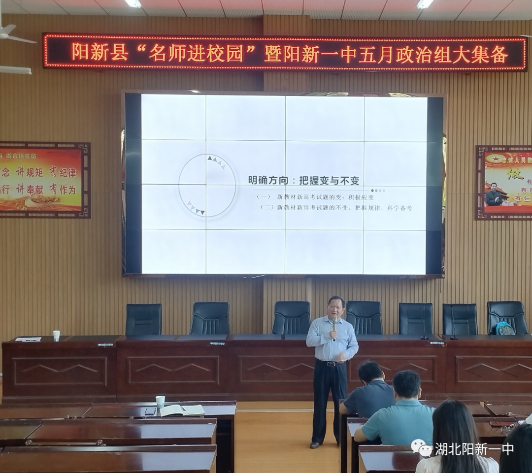 2023年5月18日下午,为进一步推动高考复习,指导学生更好冲刺高考,由阳新教科院组织,阳新一中承办的“名师进校园”活动在明道楼报告厅进行。本次活动主讲人是武汉市教科院张祖涛老师。县教科院副院长郑宏图、阳新一中全体政治老师、县内兄弟高中政治教师代表参加活动。活动由阳新一中高三政治组组长阮家浬主持。