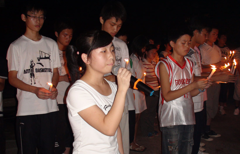 8月15日晚上7:00,我校校长赵立中与学生一起在操场举行“同‘舟’共济”,威武不‘曲’,为舟曲祈祷”活动。