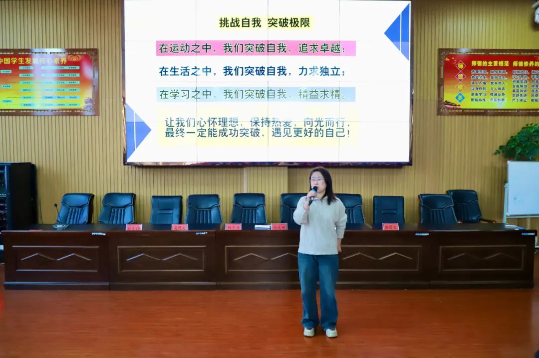 我校全能型班主任李玲玲老师带领全班学生给与会人员上了一堂《突破极限、挑战自我》的主题班会课,李老师充分调动学生的积极性,开展一系列活动,引导学生在运动之中突破自我,追求卓越;在生活之中,突破自我,力求独立;在学习之中,突破自我,精益求精。