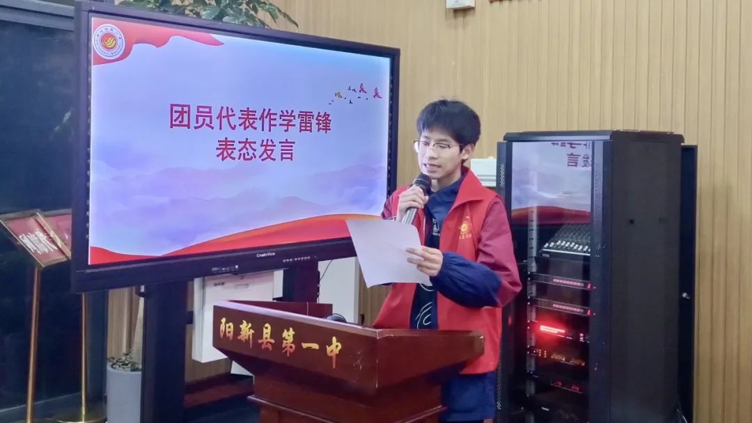 来自高二(20)班的何亚军同学,代表团员作表态发言,承诺“践行雷锋精神,争做文明学子”,并引领全体团干及志愿者们,宣读《关于向雷锋同志学习的倡议书》。