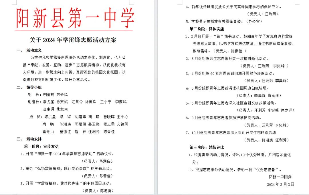 校团委制定了《阳新一中2024年雷锋活动月方案》,以推进我校学雷锋志愿服务活动常态化、制度化。除了主题班会、团日活动宣讲、校内广播宣讲、电子大屏展出等雷锋精神学习外,校团委还策划了青年志愿者“学雷锋”活动,比如街道清洁、植树绿化,护学护岗、生态环保、社区文明宣讲等系列活动,让学雷锋活动落到实处。