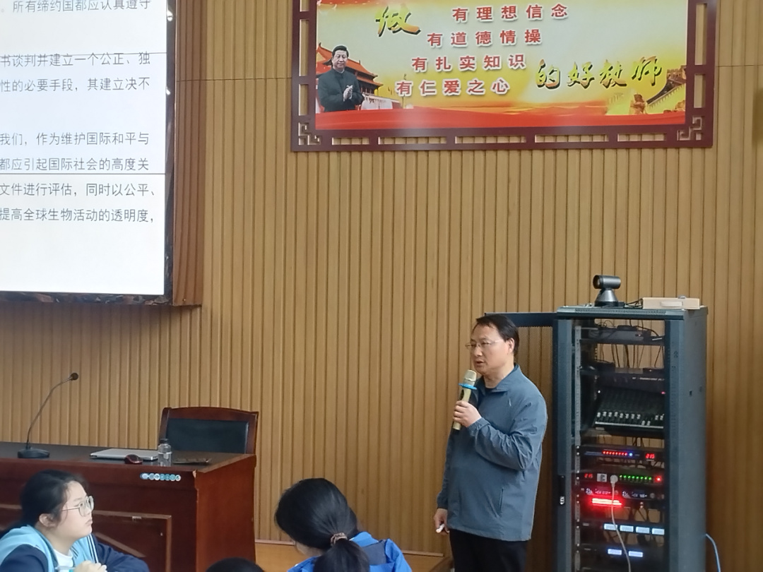 2024年4月12日上午,为进一步推动高考二轮复习,指导学生更好复习备考,由阳新教科院组织,阳新一中承办的“名师进校园”活动在明道楼报告厅进行。本次活动主讲人是武汉二中金本德老师。县教科院副院长郑宏图、阳新一中全体政治老师、县内兄弟高中政治教师代表参加活动。活动由阳新一中高三政治组组长定绍朋主持。