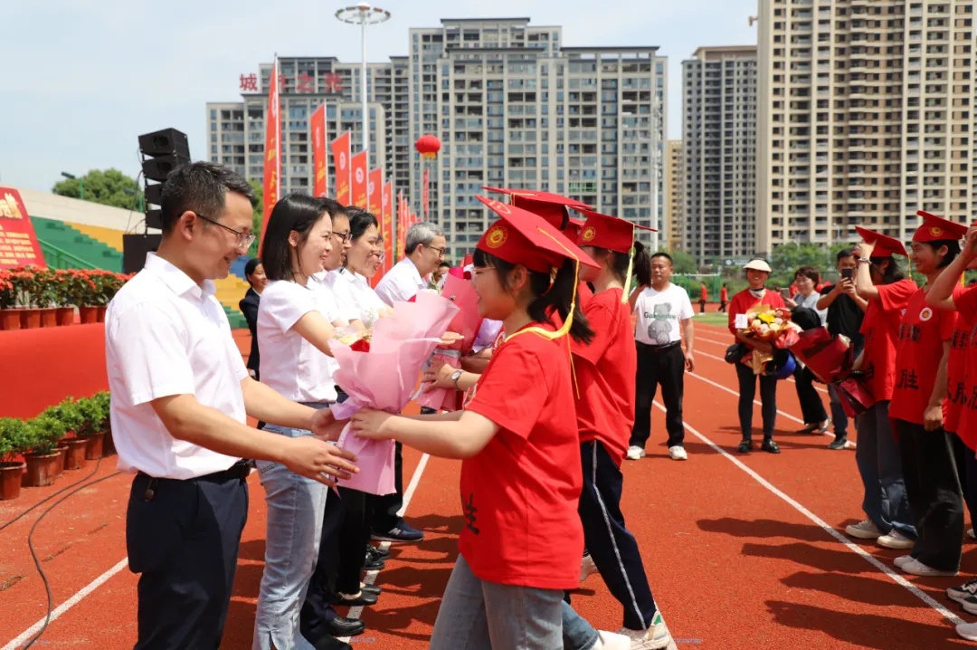 十八而志,责有攸归;十八而志,大任始承。冠礼仪式上,学生代表为主席台领导和嘉宾献花。人大常委会副主任吴素贞、校党委书记明道树等领导为学生代表佩戴纪念章,家长们为孩子佩戴成人礼帽,成人徽章,赠送《中华人民共和国宪法》手册,场面庄重而又温馨。胸佩灵动的成人徽章,头戴火红的成人礼帽,宣告新篇章的开启,寓意新高考的胜利。