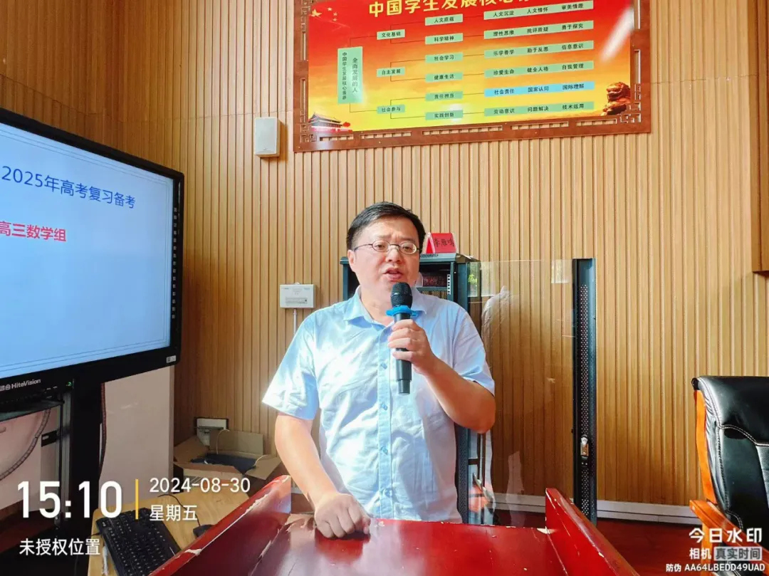 随后2025届高三数学备课组长冯美善老师汇报了2025届高三数学三轮复习规划:一轮基础复习积累——知识+能力;二轮专题复习提升——能力+素养;三轮强化训练巩固——素养+状态。冯老师还分享了自己在备考过程中根据学情制作微专题的备考历程。