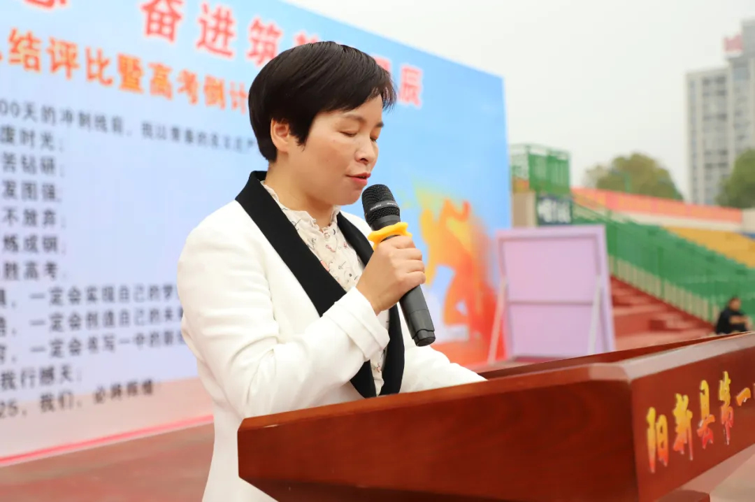 在代表发言环节。高三23班的柯有榤同学作为学生代表,分享了个人关于考试的一些学习心得。家长代表刘元香女士则以《奋斗青春,精彩未来》为题,劝勉同学们珍惜当下的一切,以梦为马,不负青春年华。数学组冯美善老师针对接下来的200天备考,提出了五点建议:树立必胜信心,增强惜时意识,讲求科学方法,调整良好心态,保障劳逸结合。