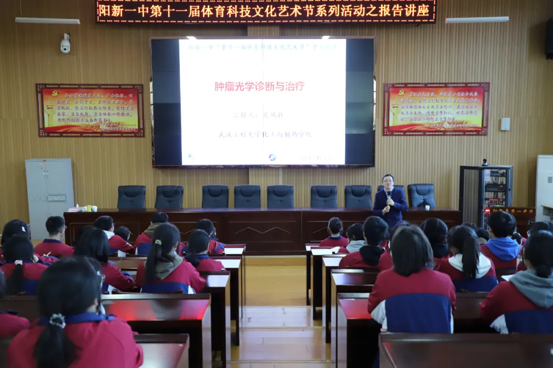 11 月 29 日下午 ,武汉工程大学吴风收教授受邀出席了阳新一中第十一届体育科技艺术节专题讲座,为高三学子带来了一场精彩讲座。在本次讲座中,吴风收教授聚焦“肿瘤光学诊断与治疗”,吸引了众多师生前来聆听学习。