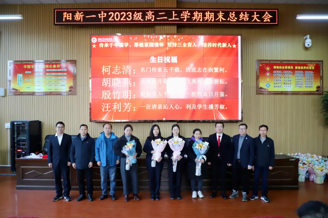 在生日祝福环节,高二年级组给生日恰逢春节的柯志清、汪利芳、胡晓燕、殷竹明等老师提前送上鲜花、奶茶和生日祝福。鲜花搭配奶茶,共品温馨时刻;润喉片配贺卡,同传诚挚祝福。同时,高二年级主任程志勇代表年级组为四位老师送上诗语祝福: