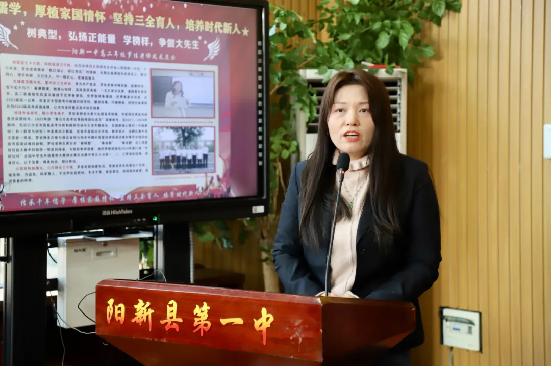 在分享经验环节,罗佳老师作为优秀学科教师代表作经验分享。在发言中,罗佳老师分享自己多次参与高考阅卷、参与联考命题、发表教学论文、指导学生竞赛、获得市县荣誉等经历,并表达要坚守育人初心,秉持“教以潜心,研以致远”的精神,始终践行以学生为中心的教学理念,不断创新教学方法,与学生共同成长的愿望和决心。