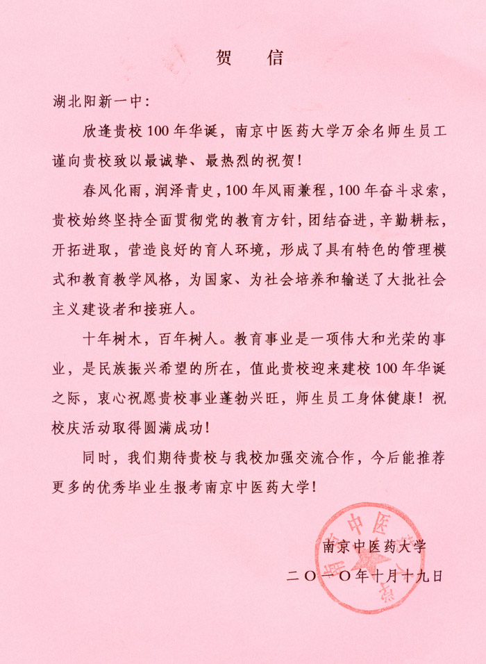 南京中医药大学贺信