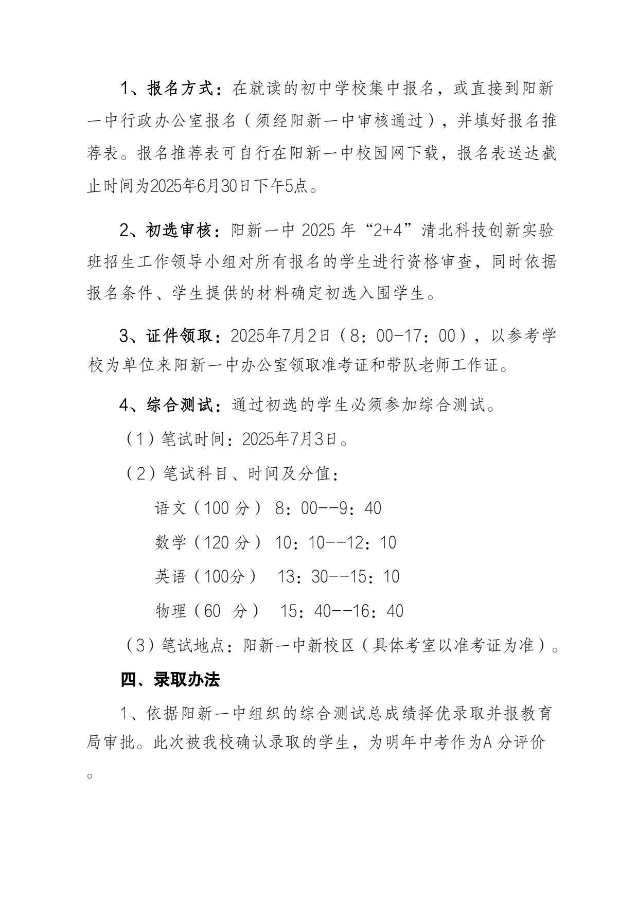 阳新一中2025年“2+4”清北科技创新实验班第二批招生方案