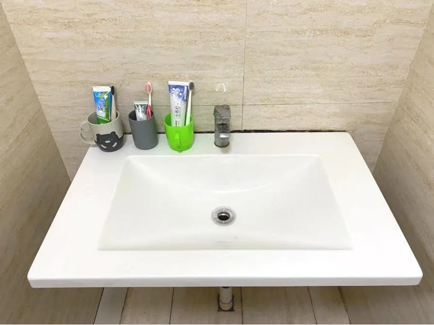2.刷牙杯整齐的摆放在洗漱台上。洗涤用品整齐摆放到墙边。