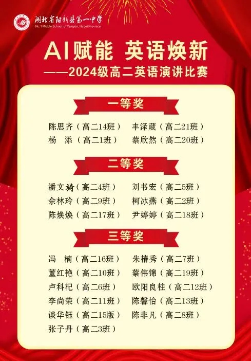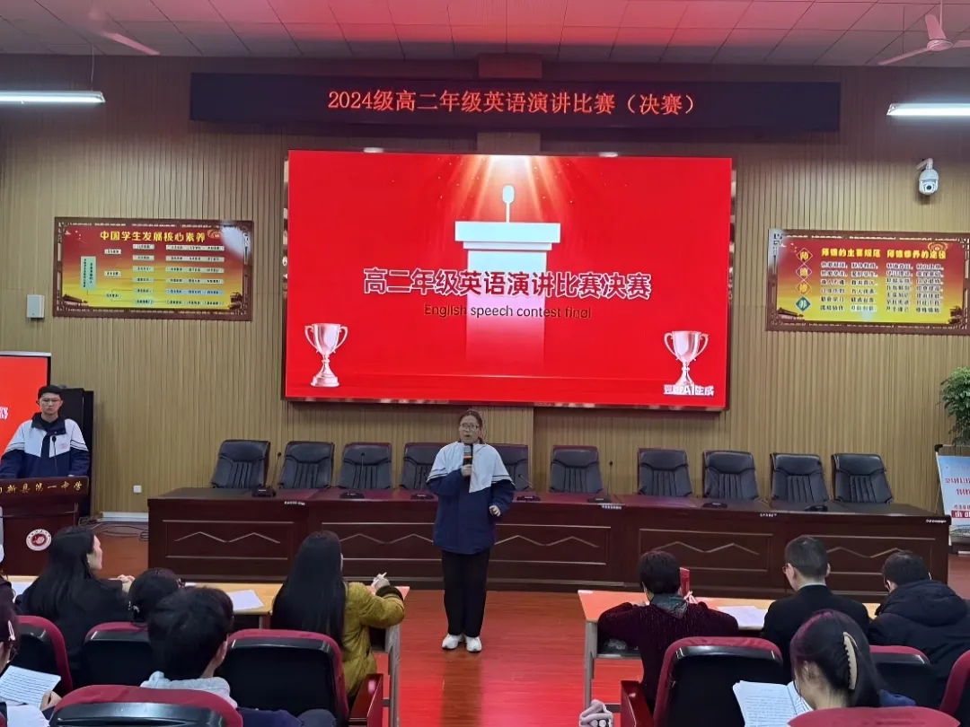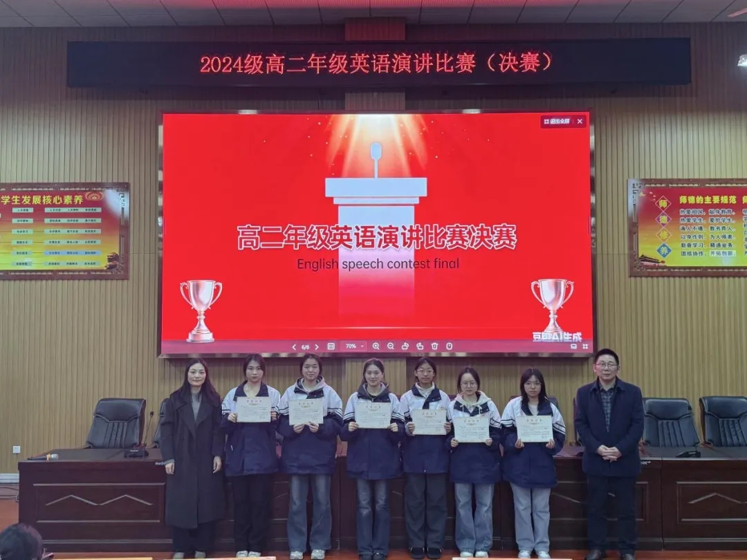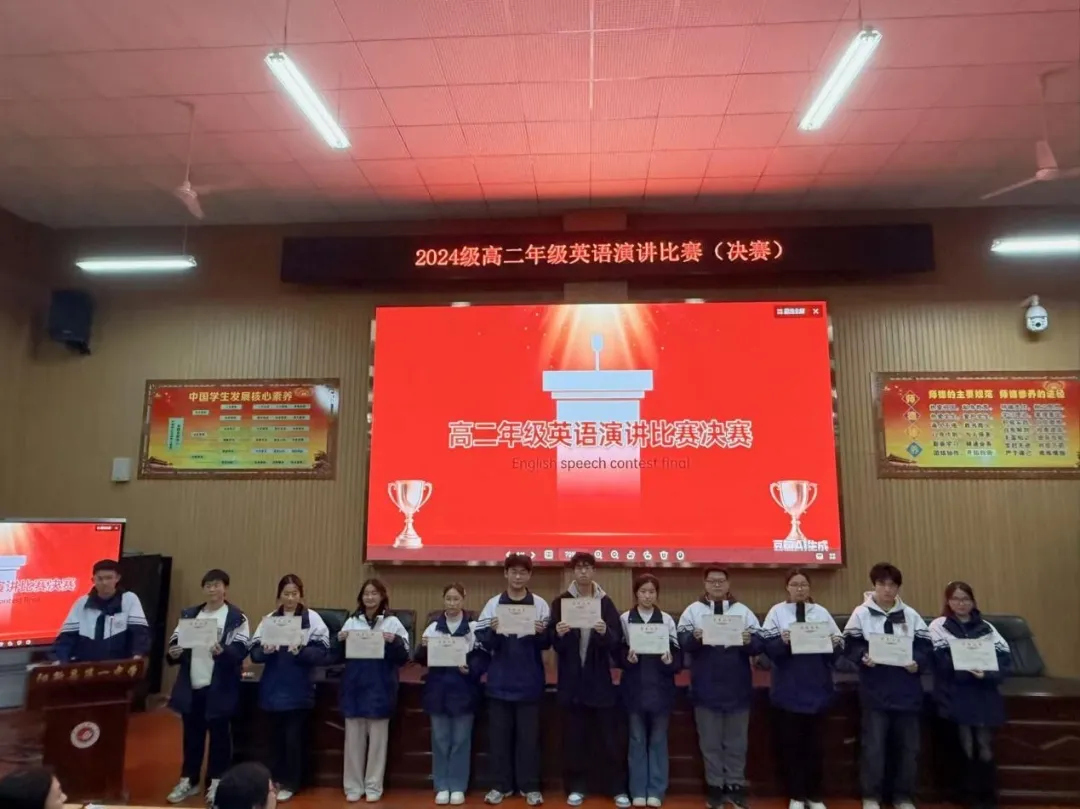 选手们既是对手,更是共进的伙伴。他们认真聆听、彼此借鉴,在思想碰撞中拓宽认知,在榜样力量中突破自我,尽显“互助互学、逐光成长”的氛围。高二12名英语教师组成评委团,从内容、表达、现场表现等维度公正评判,评选出一、二、三等奖,获奖名单通过校园展板公示表彰,为演讲赛事画上圆满句号。