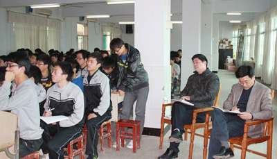 校长赵立中(左二)、副校长明道树(左一)与学生一起听课 |