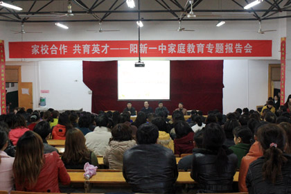 郑子岳老师为家长作专题报告 家庭教育报告会在学校一楼阶梯教室举行 家庭教育报告会现场 家庭教育报告会现场
