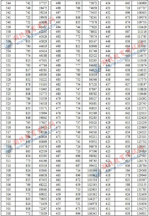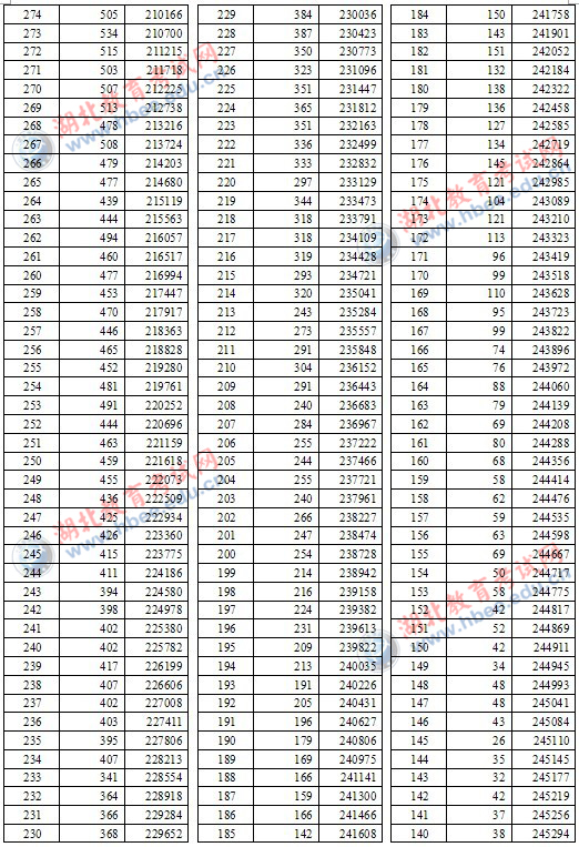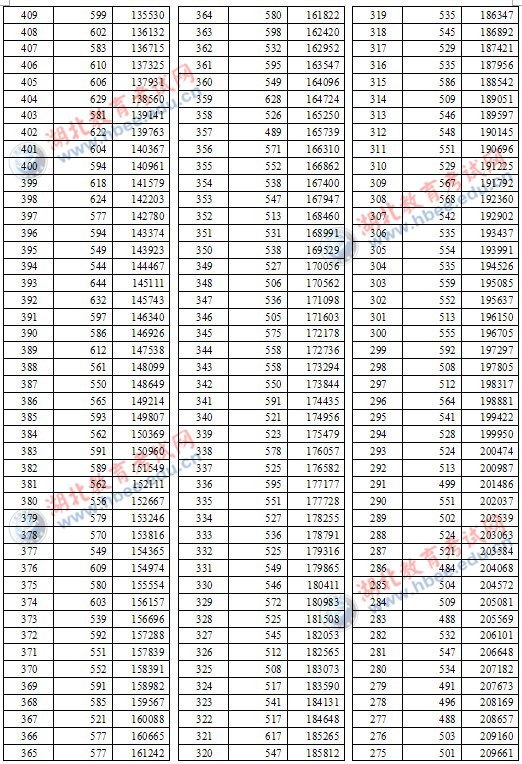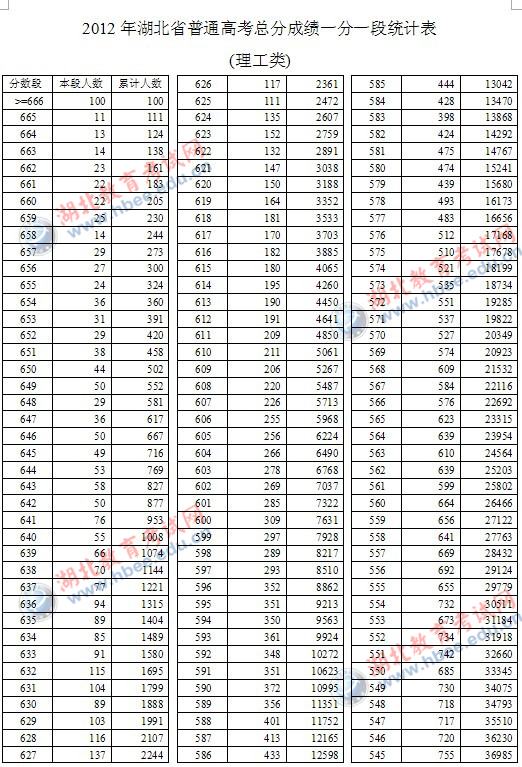 2012年湖北省高考一分一段统计表(理工类)