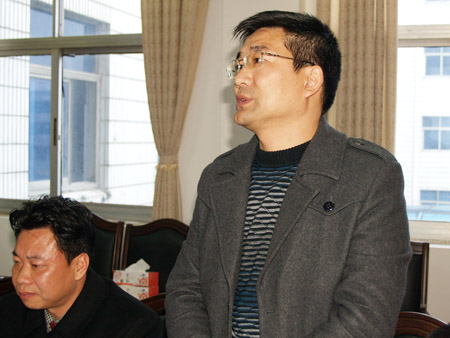 阳新县中语会新任会长明道树站着发表了自己的履新感言。在感言中,明会长深情地感谢柯友国局长、刘少兰副局长的信任,感谢董谊域老会长、胡家朗主任的关心,以及各位同仁的抬爱。同时,明会长还感谢各位领导、专家莅临阳新一中指导工作,并深入教室,感受阳新一中语文课堂;感谢阳新县各基层学校向阳新一中输送优秀人才。并向与会的各位领导、专家表态。明会长说:我担任中语会会长,深感荣幸,责任重大,有种迫切的使命感。任会长后,我一定要为阳新县语文教师,特别是青年语文教师搭建专业成长的平台;一定要为各位专家所在学校的语文教育发展尽力;一定要为阳新县中 语会团队的发展,为各位专家的发展,发挥桥梁和“人梯”作用。