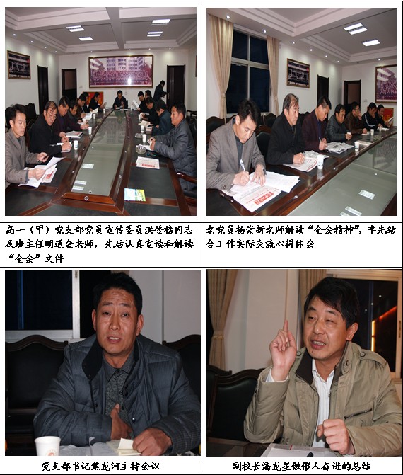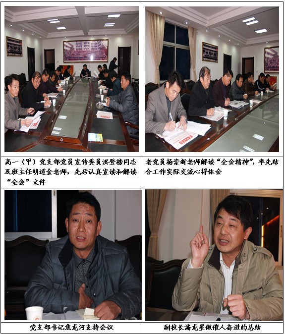 12月5日晚19:00—21:30,阳新一中高一(甲)部党支部召开了党员扩大会议。会议由支部书记焦龙河同志主持,支部全体党员和高一(甲)部全体班主任参加了会议。会上,大家学习了十八届三中全会《决定》全文,了解了全会精神,并结合国情展望了中国梦,结合校情畅谈了教育梦。党总支委员、副校长潘龙星同志最后做了精彩的总结。