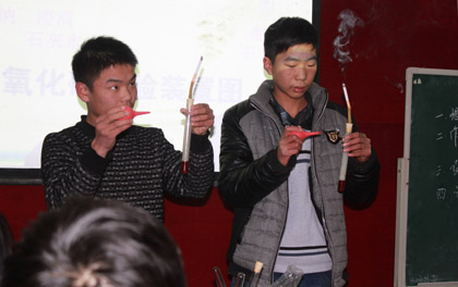 会前,由青年教师曾文静以小组合作探究模式主讲公开课——《初探香烟烟雾中的某些成分》,她的课堂分组合理,导入精彩,言语恰当,引导巧妙,气氛活跃,发人深省,凸显了学生的主体地位,得到了全场与会人员的肯定。把课堂搬进会场,这在我校还属首次,其目的是让全校教师通过现场观摩更深入地了解新课改的教学理念,学习、掌握新课改的课堂教学模式。