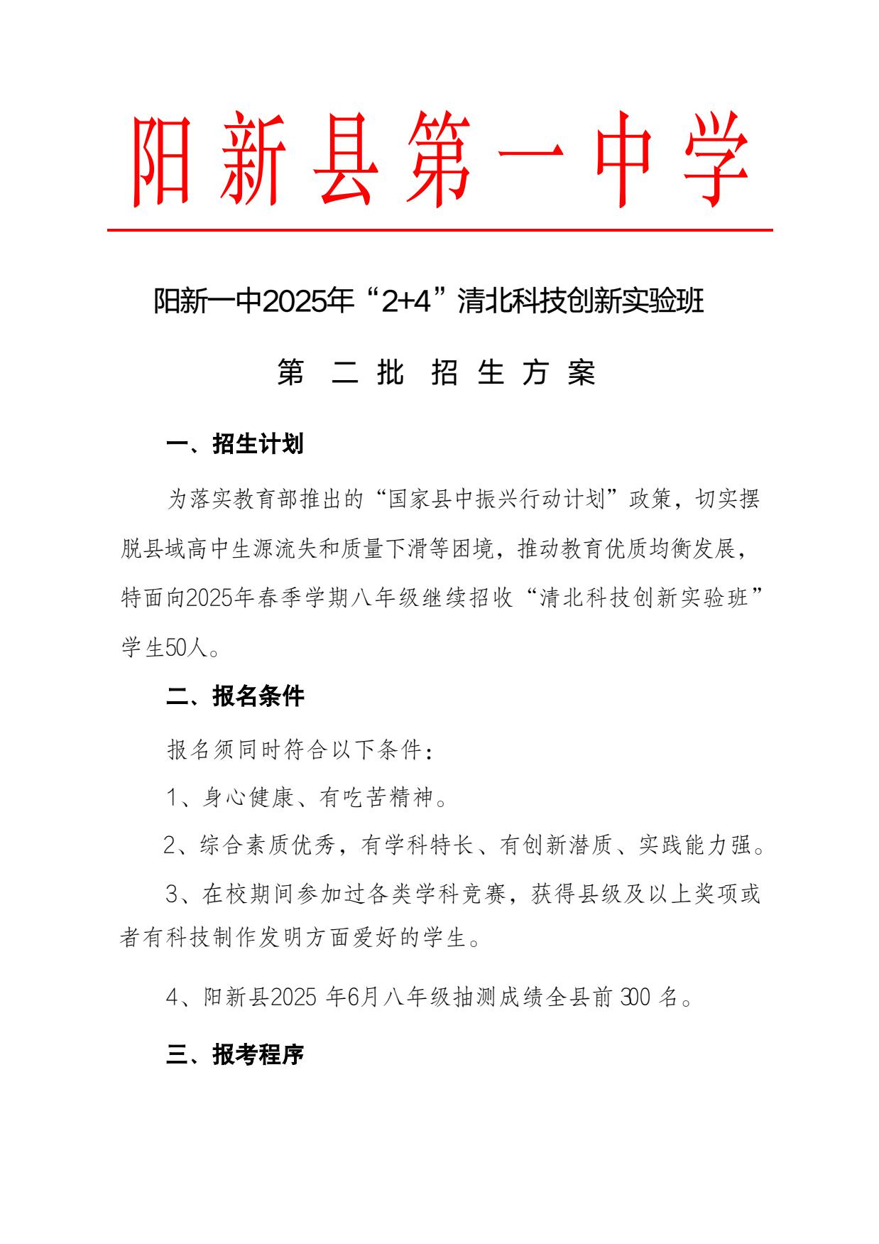 阳新一中2025年“2+4”清北科技创新实验班第二批招生方案
