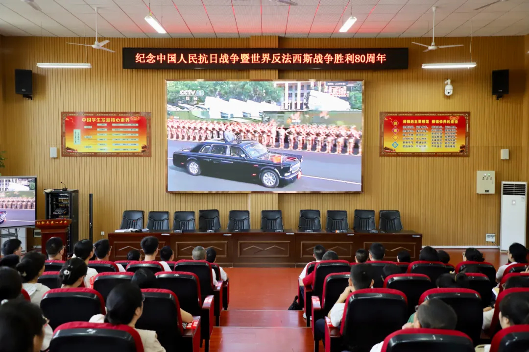 9月3日是中国人民抗日战争暨世界反法西斯战争胜利80周年纪念日,阅兵是纪念历史、致敬英雄的重要仪式,不仅承载着对革命先辈的深切缅怀,更彰显着国家维护和平、砥砺奋进的坚定信念。为引导学生共同铭记历史、缅怀先烈、珍爱和平,传承和弘扬以爱国主义为核心的伟大民族精神,培育学生的家国情怀与历史责任感,开创美好未来,9月3日上午9时,校党委书记方长风、校长江章令及全体校委委员、四十岁以下青年教师、200余名学生一起学校在校明德楼报告厅观看阅兵仪式,高一、高二、高三年级其余3000余名学生在各班同步观看阅兵仪式,活动由校党委委员李雁鸣主持。