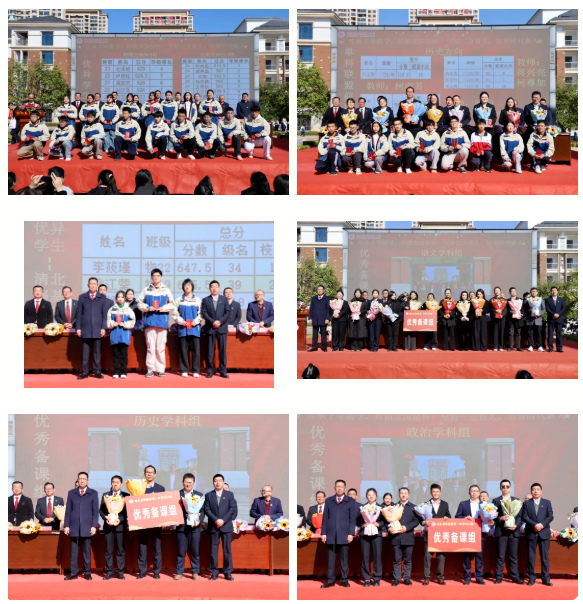 德育室副主任秦青山老师宣读各班期中评比表扬名单,陈松林主任宣读期中考试优胜学子、优秀备课组、优胜班级名单。与会领导为受表扬学子、备课组、班集体颁奖授花,灿烂的笑容与鲜艳的花朵相映成趣,成为广场上最动人的风景。