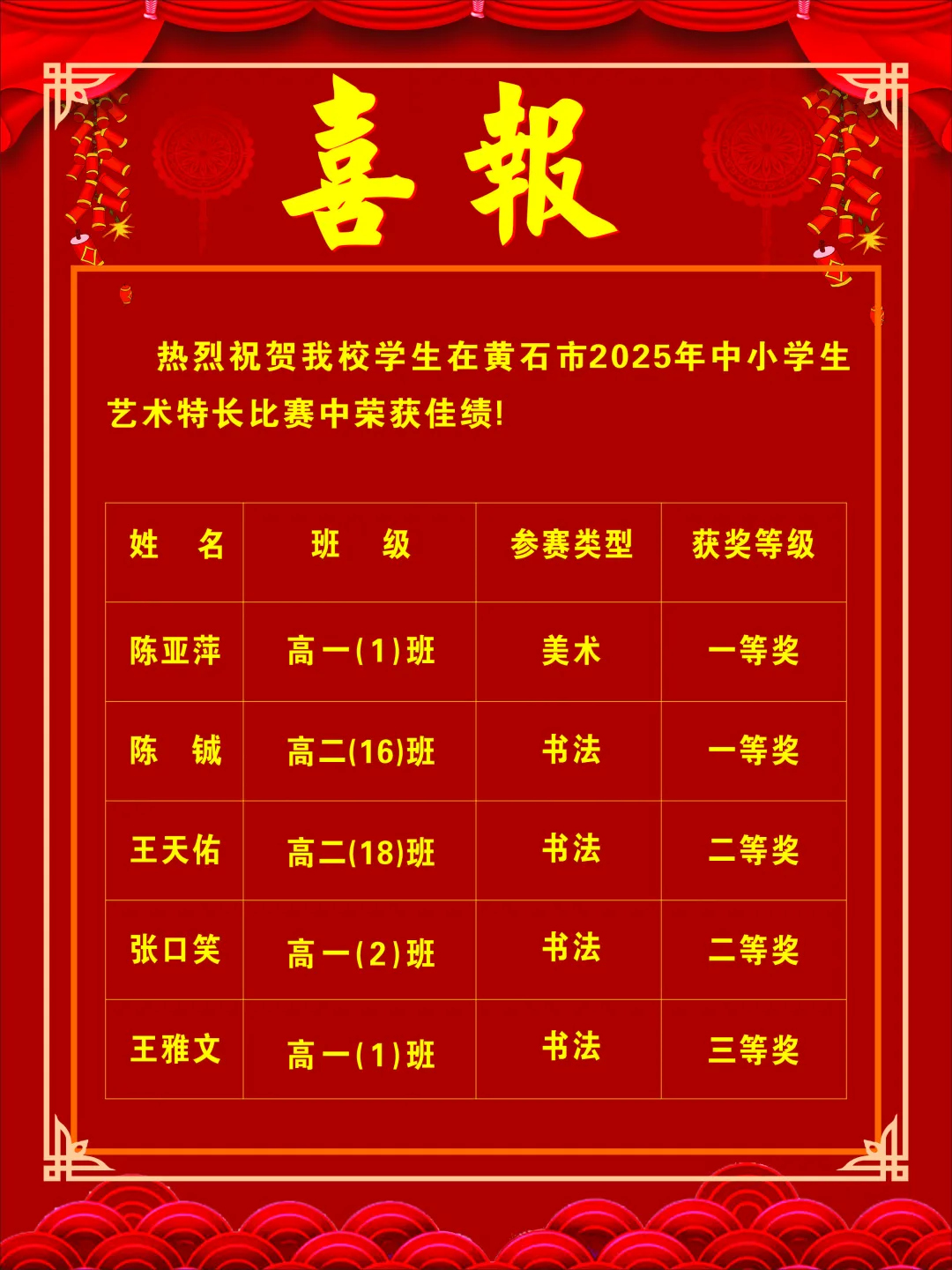 黄石市2025年中小学生艺术特长比赛近日圆满落幕。我校选派五名学生参赛,并在此次比赛中取得优异成绩!