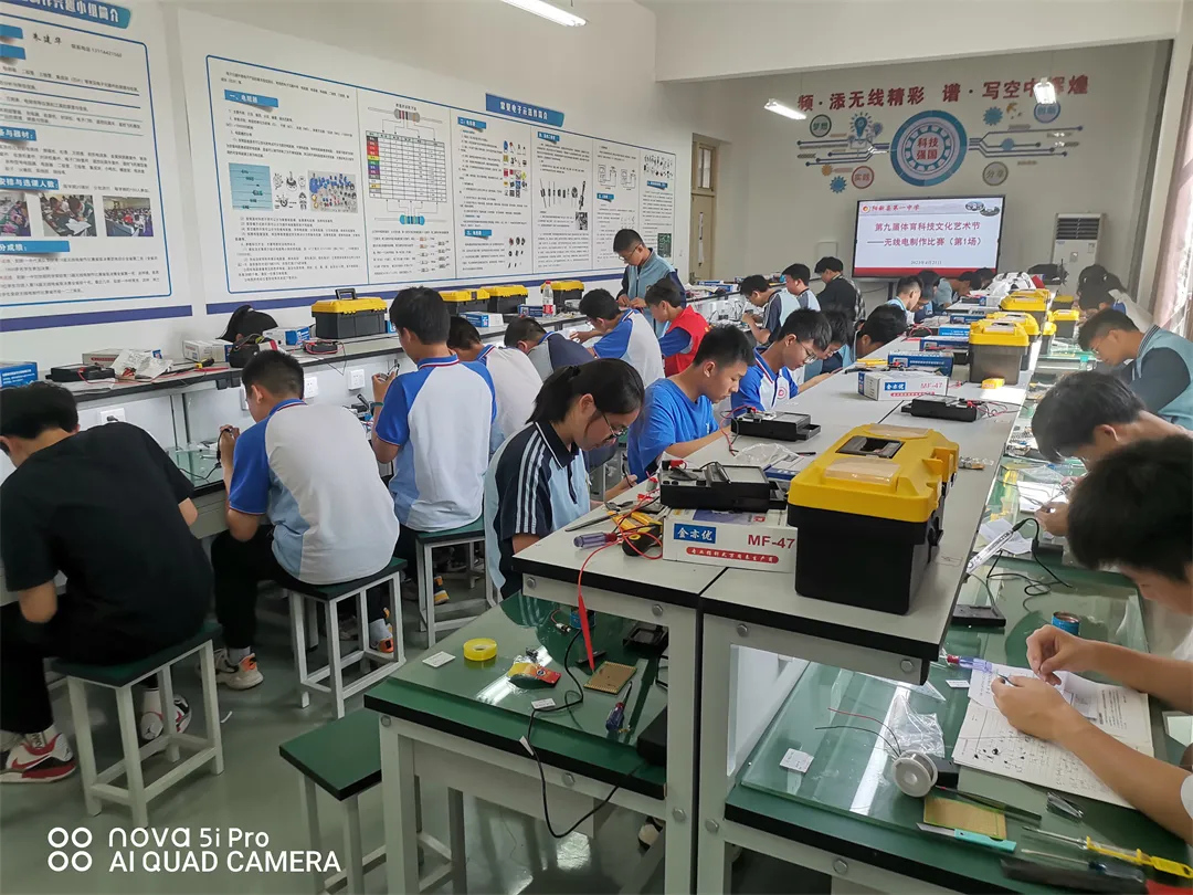 在硬件保障方面,学校建成了功能完备的校园科技馆,场馆面积1373平方米,涵盖科普展览馆、矿物标本室、科普阅览室、无线电制作室、人工智能实验室、科普e站等多个功能区域,拥有固定展品90多台套、流动展品50多台套,内容覆盖物理、化学、数学、地理等多学科知识。自开馆以来,科技馆坚持免费向全体师生及社会公众开放,累计接待科普爱好者20000多人次,辐射周边多所中小学,成为区域科普教育的重要阵地。此外,我校还免费为参加培训的学生提供机器人教学器材、金属探测器、振动报警器等实训设备,助力学生开展科技实践。