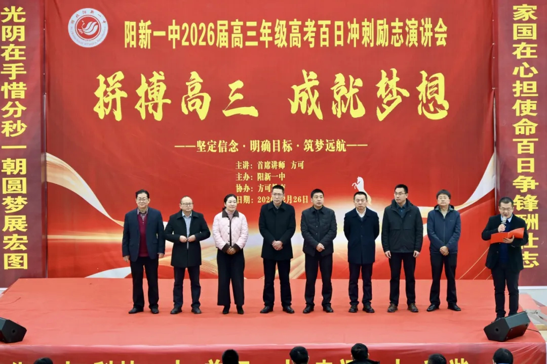 春风化雨育桃李,万物复苏谱新篇。为激发高三学子冲刺高考的斗志,点燃决胜未来的激情。2月26日9时28分,我校2026届高三年级在校体育馆举行高考百日冲刺励志演讲会。校党委书记方长风,校党委副书记、校长江章令及校党委班子成员为高三学子加油鼓劲。此次大会由校党委委员、副校长刘杰主持。